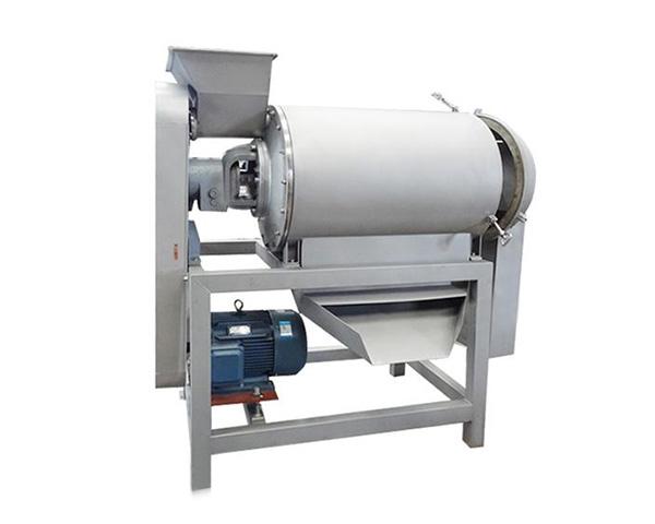 電機通過三角帶傳動,使安裝在花鍵軸上的刮板高速旋轉,當經過破碎的水果通過進料口進入機內時,擋漿盤將物料均勻排發到刮板和篩網之間,由于刮板的回轉作用和導程角的存在,使物料沿著園筒向出口端移動,移動的軌跡呈螺旋狀,物料就在刮板和篩網之間移動過程中受離心力的作用而被擦碎,汁液和肉質(已成漿狀)從篩孔通過進入下道工序(雙道打漿機為聯動重復上列過程),皮和籽等則從出渣斗排出,從而達到自動分離的目的。只要變換不同規格的篩網以及調整刮板導程角的大小,可改變不同的打漿速度,獲滿意的效果。