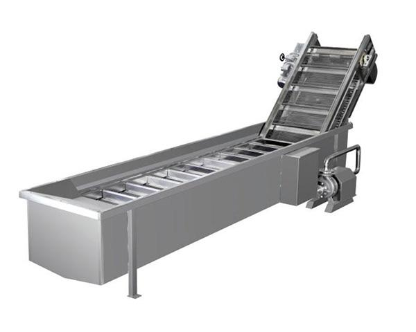 物料在網帶輸送經過水中緩慢地淋洗,出料端設有噴淋,特別適合桑葚、草莓、黑霉等柔軟易損壞的水果清洗。自帶提升,方便聯線。