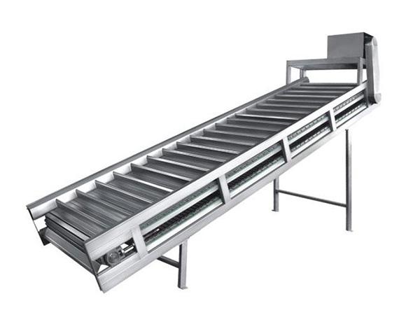★該機的輸送鏈部分有三種組成型式:a、折邊平板+擋板固定在帶彎板鏈條組成,鏈條為大滾子鏈,滾珠在耐磨塑料墊條上作滾動摩擦,噪音小,經久耐用;b、符合食品衛生的聚酯網帶+擋板的組成;c、注塑成型的符合食品衛生的塑料鏈板和銷軸直接組裝而成,具有重量輕、拆裝方便等特點;